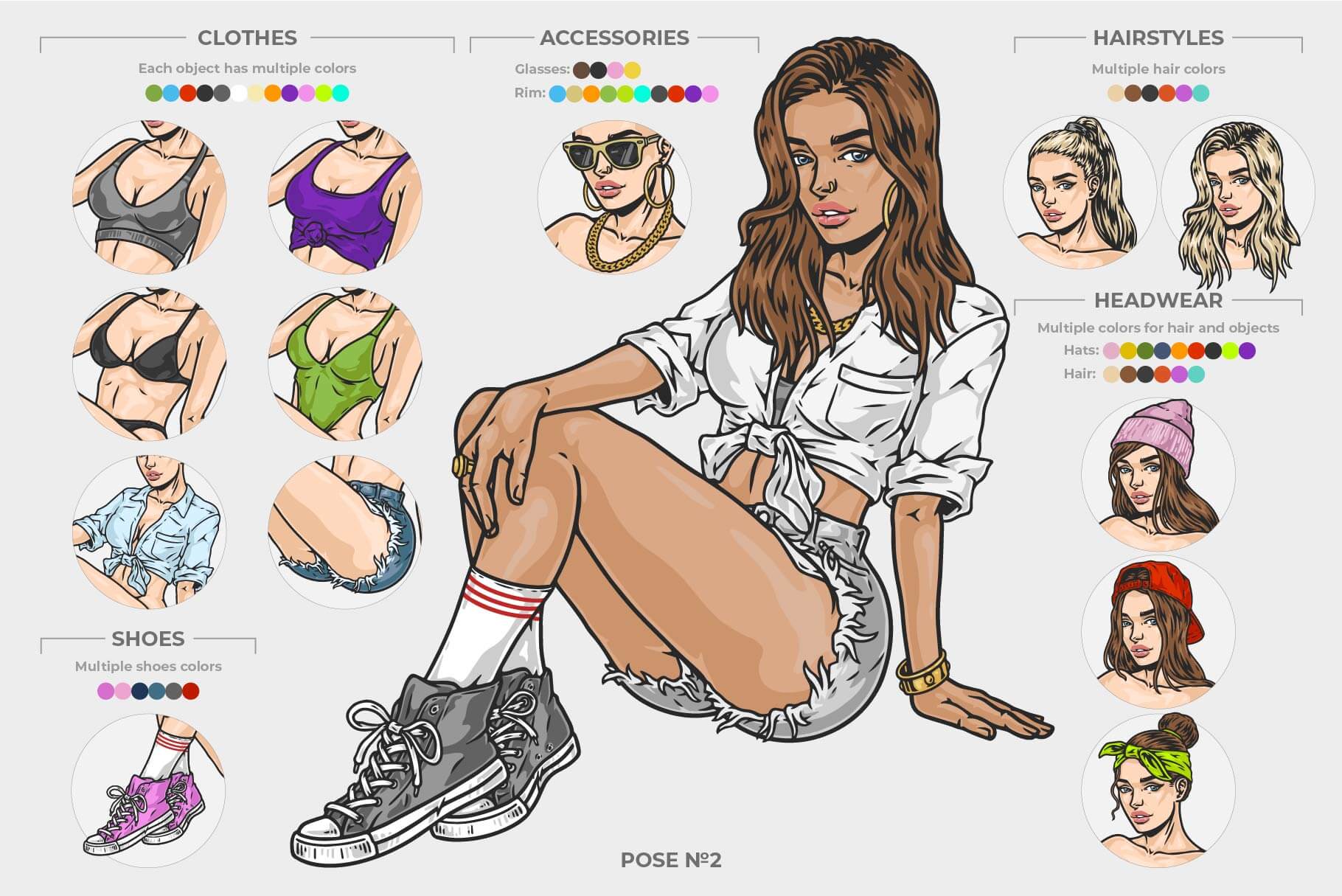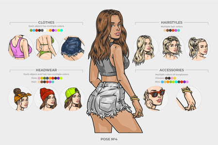 A modular character creator with editable female poses, designed for building custom illustrations and design compositions.